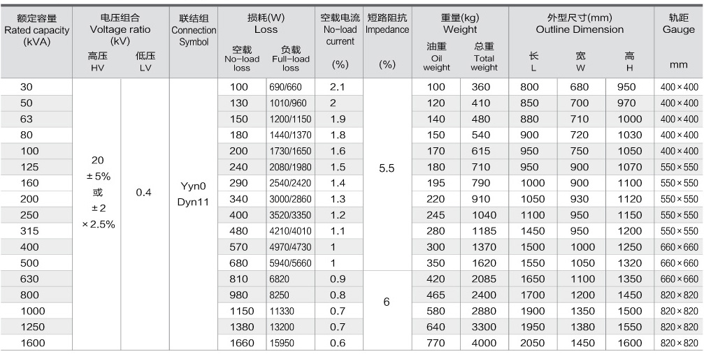 主要特點(diǎn)與技術(shù)參數:Main functions and characters 采用先進(jìn)電磁設計軟件設計,性能符合IEC60076、GB1094、GB/T6451、GB/T25289-2010標準。無(wú)儲油柜、吸濕器等裝置,確保變壓器油不與空氣接觸,能提高變壓器油抗氧化能力,延緩變壓器油老化。鐵心采用優(yōu)質(zhì)冷軋晶粒取向硅鋼片,全斜接縫疊片結構,從而降低空載損耗和空載電流。油箱為波紋油箱,波翅可以隨變壓器油體積的脹縮而脹縮,從而使變壓器內部保持一定的壓力,增強運行可靠性,變壓器外表抗腐蝕能力強。配電變壓器線(xiàn)圈采用高強度漆包線(xiàn)(或紙包線(xiàn))卷繞,安匝分布均勻,絕緣結構合理,具有很強的抗短路能力。配電變壓器器身采用免吊芯結構,密封件采用優(yōu)質(zhì)丙烯酸酯橡膠,能有效防止光老化、熱老化。 S11-M系列三相雙繞組無(wú)勵磁調壓20kv配電變壓器